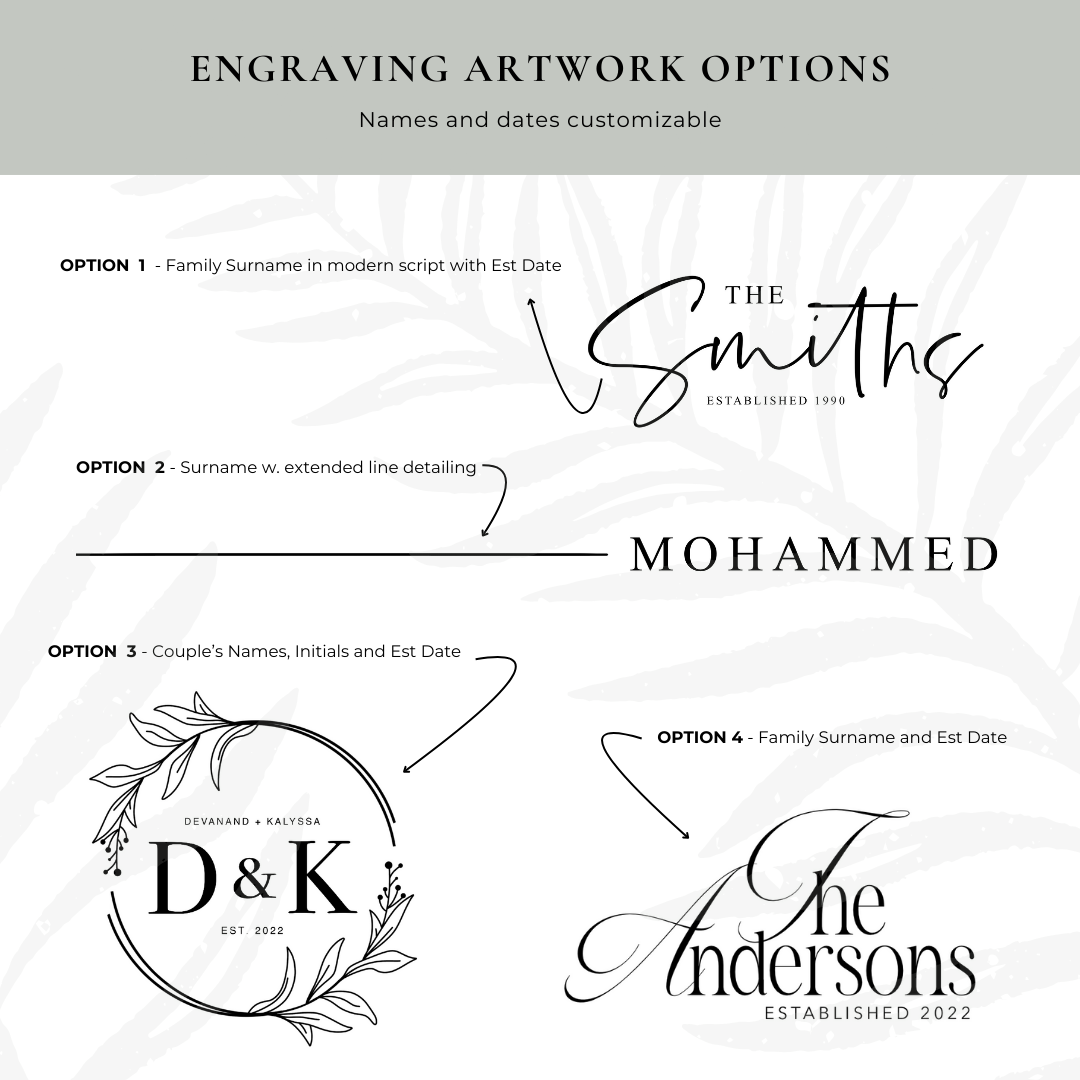 ⌂ Custom Engraving - Couple's Names + Est Year, Family Name + Est Year