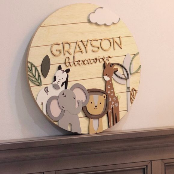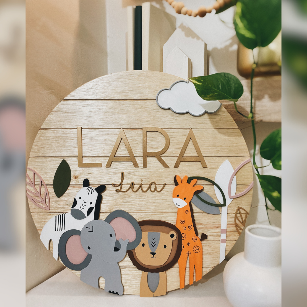 Add a playful safari vibe to your child’s room with this handcrafted name sign! Featuring adorable jungle animals and customizable with any name, this wooden sign is the perfect addition to nursery decor or a unique gift for little explorers.
